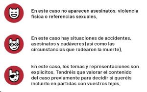 Pues sí, en esta ciudad hay de todo y nada es especialmente bueno. Dadas las diferentes temáticas que se despliegan a lo largo de los 16 casos contenidos en cada caja podemos imaginar que habrá de todo, y cuando digo TODO quiero decir TODO. No voy a destripar nada, pero hay capítulos de series o películas con tramas truculentas o enrevesadas que están dentro de lo que propone algún caso de los «para adultos» de este juego…aunque lo haga de manera no muy explícita queda claro que hay temas adultos en algunos de ellos. Advertidos quedan, e imagino que con algo de curiosidad, por ver de qué se trata.